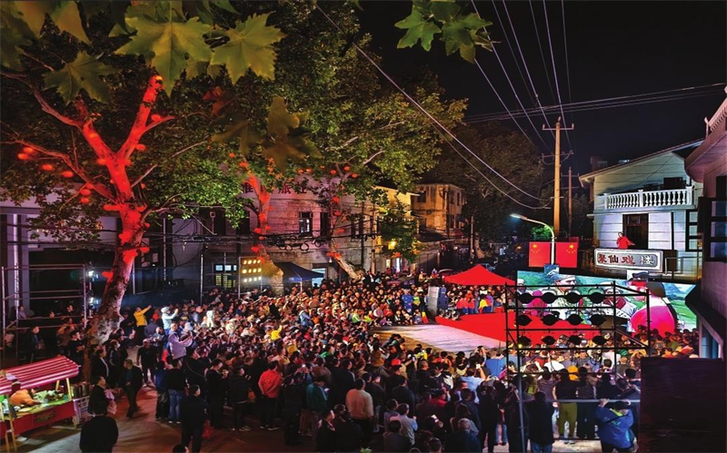 10月12日晚,田家庵區2025年淮河老街1952“漫步老北頭轉角遇到戲”首屆少兒戲曲大賽在東城市場北門聚仙戲樓門前熱鬧開演。